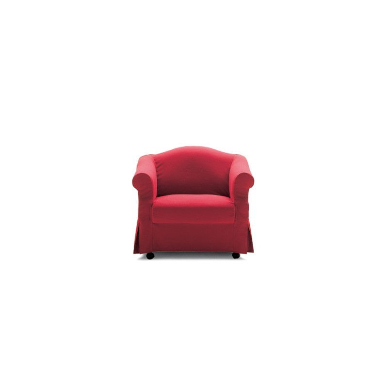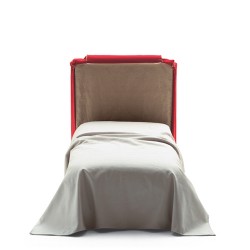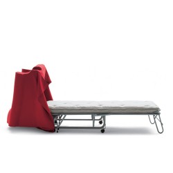 Poltrona letto. Imbottiture in poliuretano espanso e fibra poliestere. Rete con doghe in legno di faggio stratificato, materasso in poliuretano espanso. Disponibile in vari tessuti.